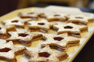 Faites tiédir la confiture de groseille et la laisser un peu refroidir. Collez un biscuit (refroidi) étoilé sur un biscuit entier en vous servant de confiture comme colle. Saupoudrez de sucre glace.